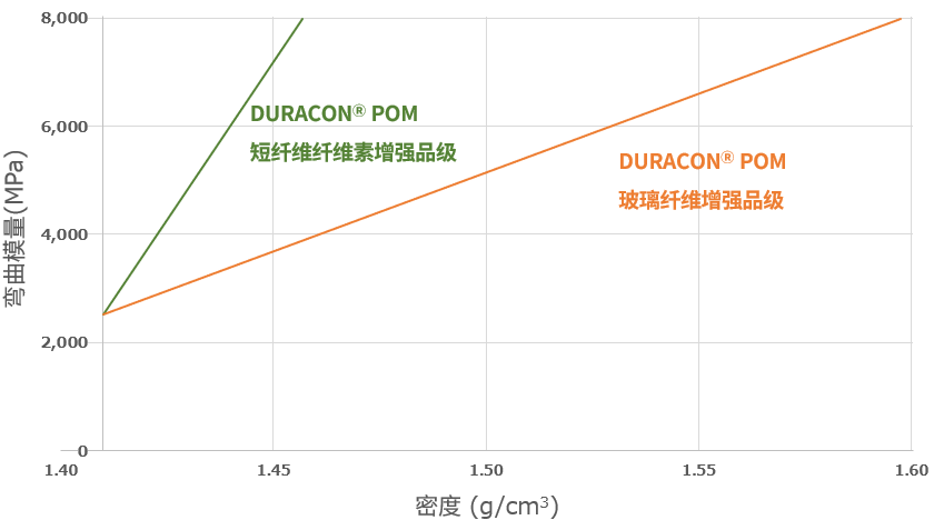 图1 DURACON POM短纤维纤维素增强品级与DURACON POM玻璃纤维增强品级的比较(相对于密度的弯曲模量)